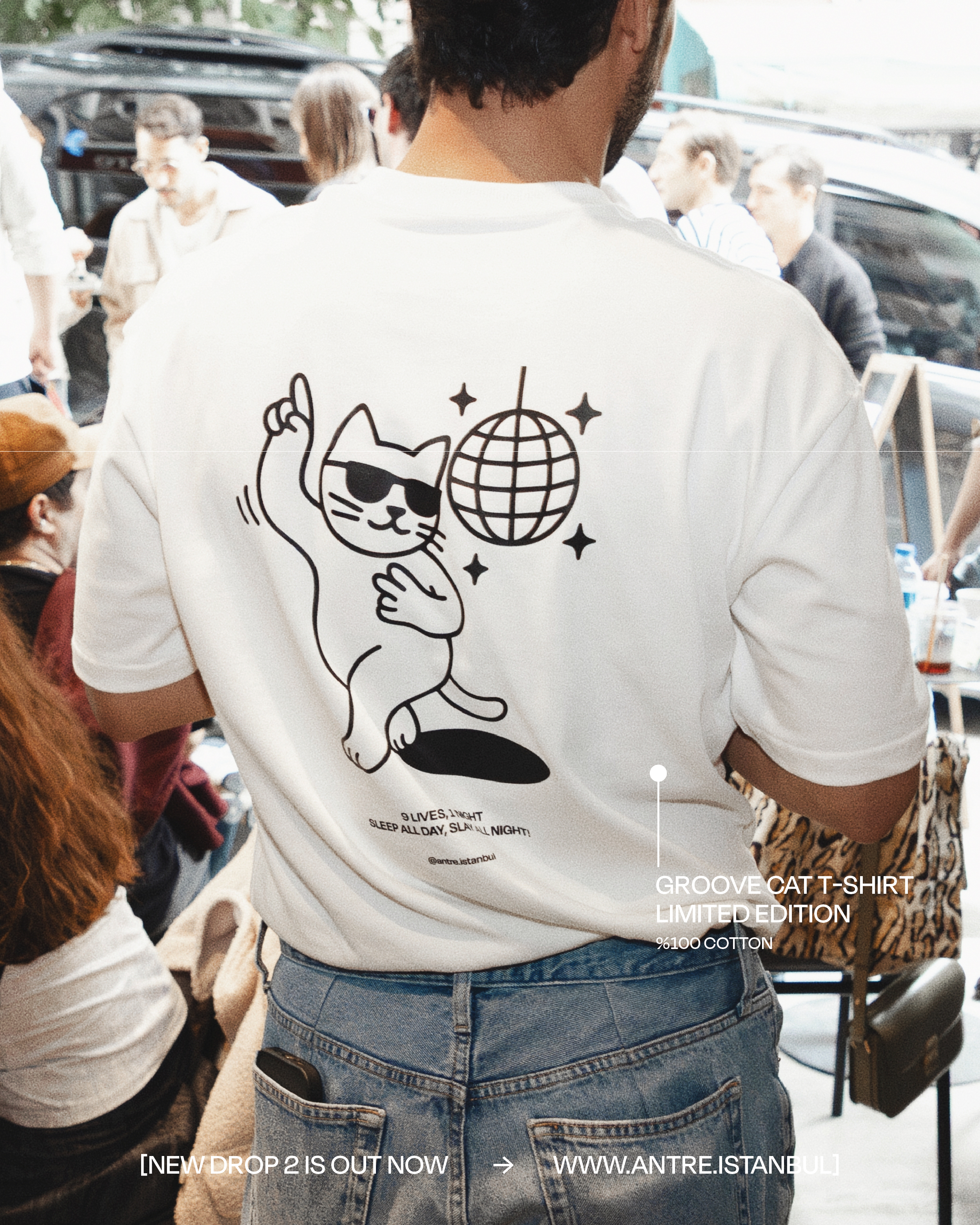 Arka yüzündeki disco ball + dancing cat illüstrasyonu, antre.istanbul’un karakteristik mizahı ve tasarım dilini taşır.